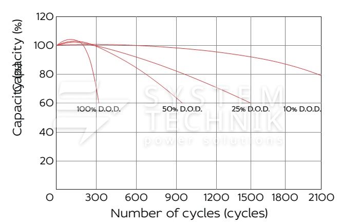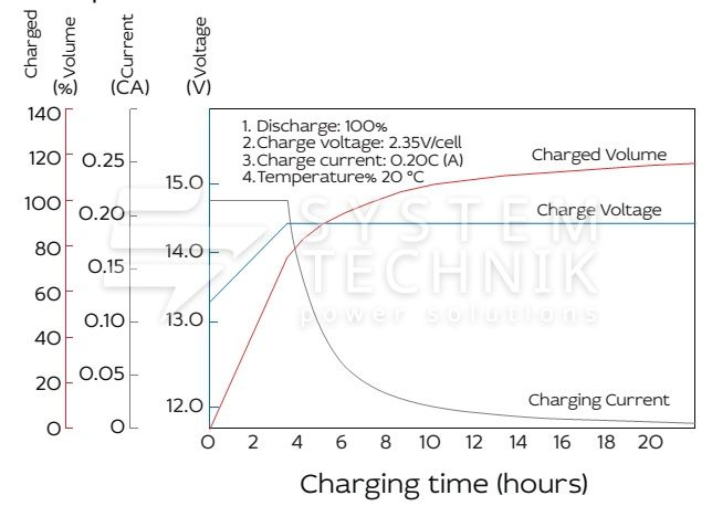 - Рекомендуемое напряжение заряда в циклическом режиме для 12В батареи: 13,8В-14,1В при 25ºС;