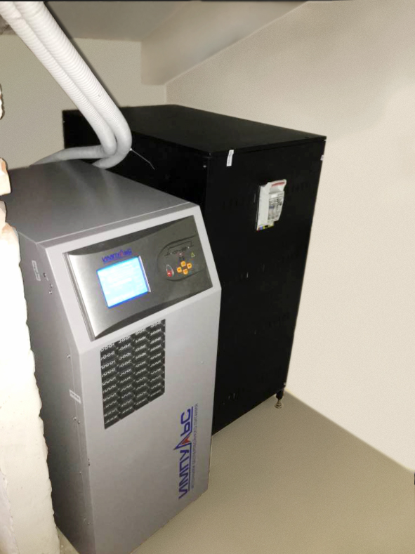 мощность 13.5 кВт (15 кВА), тип: с двойным преобразованием, напряжение (вх./вых.) 380В / 220В, габариты 600x900x1400 мм